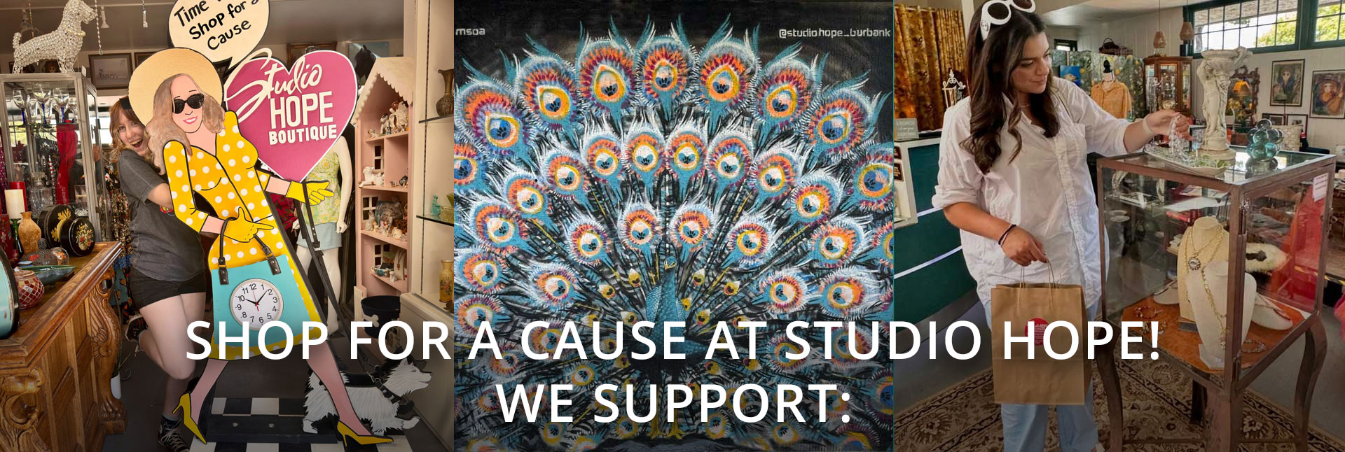 Shop Studio Hope` for vintage clothing, furniture, home decor, accessories, designer items at great prices, wall art, and one-of-a-kind jewelry. Take a selfie with Saffire the Peacock and tag us @StudioHope_Burbank!