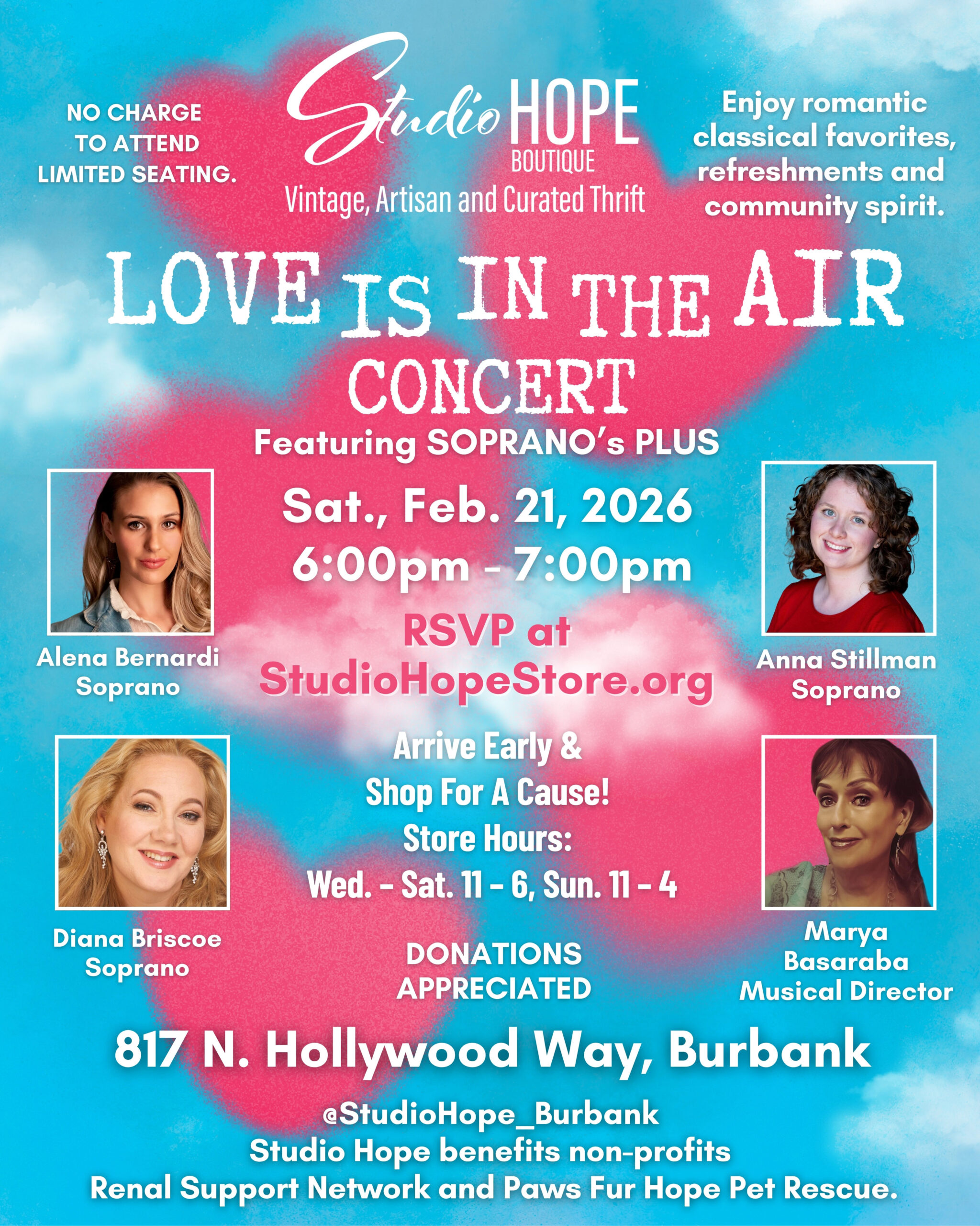 Love truly is in the air! Join us for an enchanting evening as Sopranos Plus fills the room with soaring vocals and timeless love songs that celebrate romance, connection, and the joy of music.