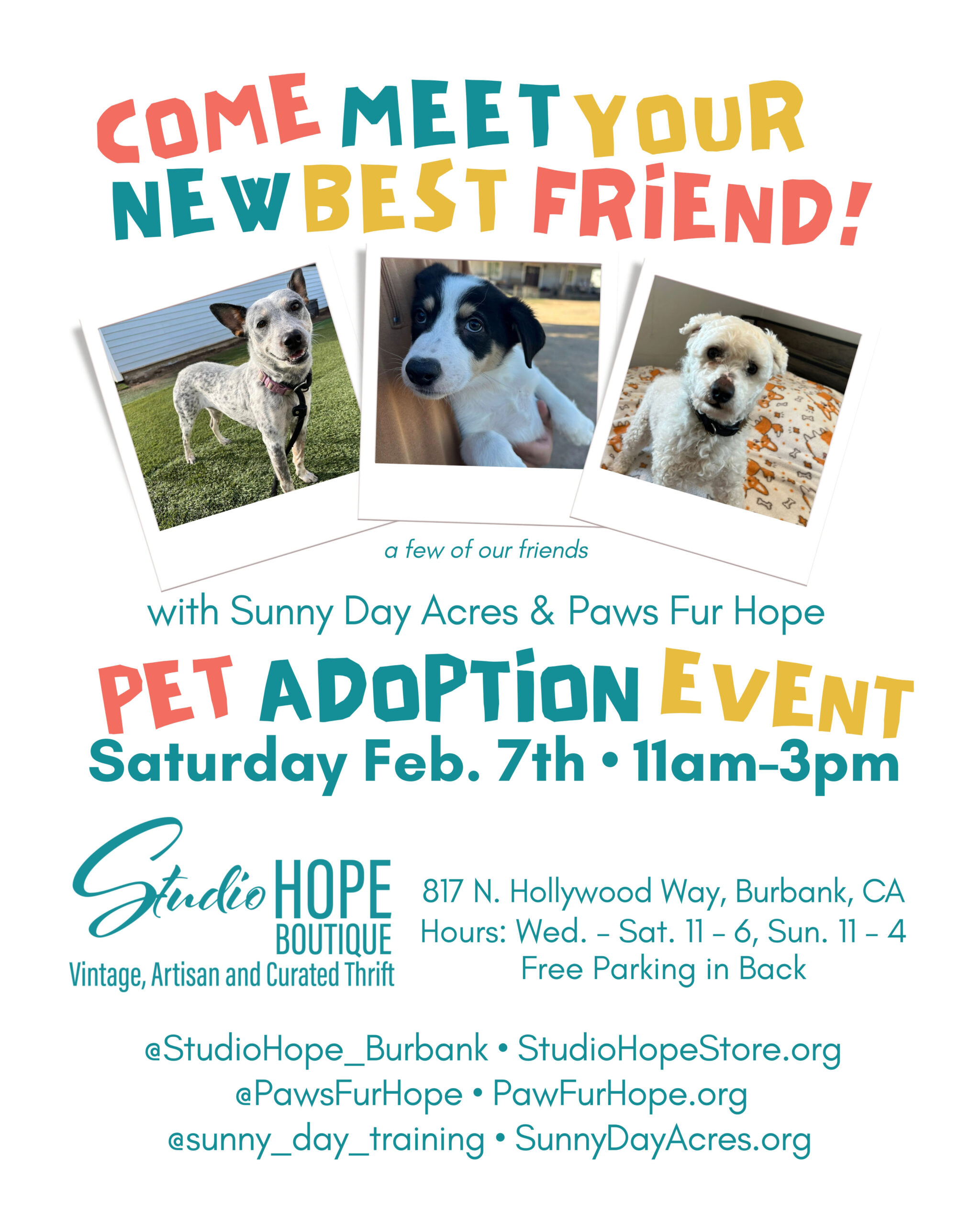 Join us at Studio Hope Boutique for a tail waggin’ pet adoption event with Paws Fur Hope and Sunny Day Acres Rescue—and enjoy a special sale happening now through February 15!