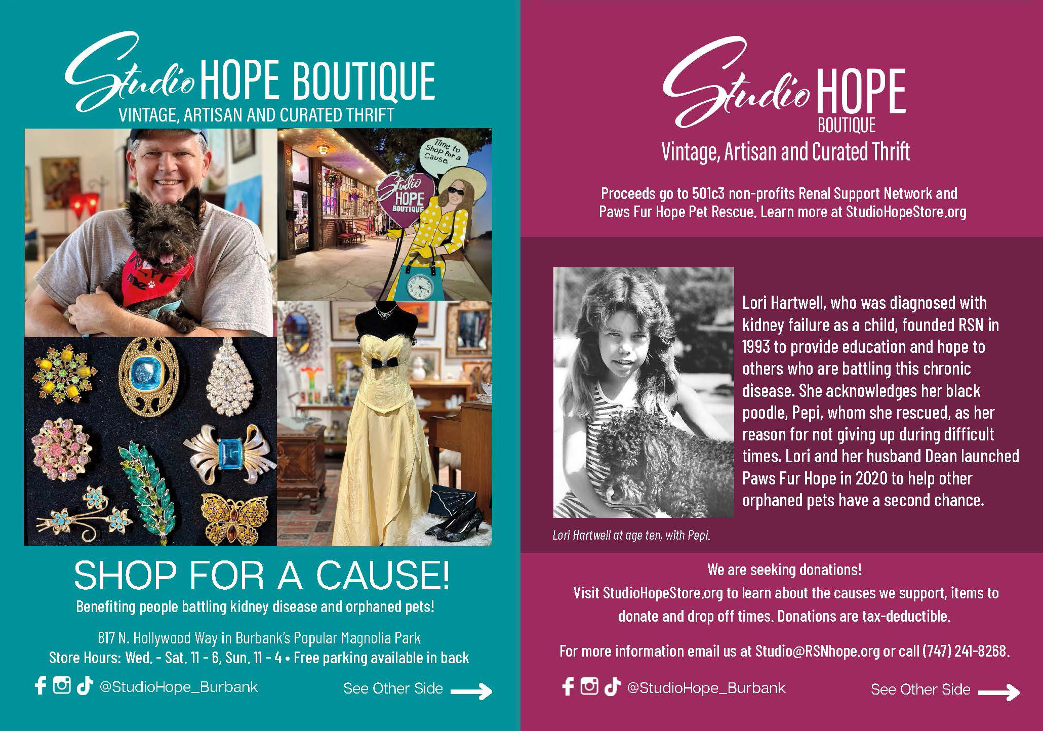 Studio Hope was founded by Lori Hartwell to bring together two 501c3 non-profits, Paws Fur Hope and the Renal Support Network–joining them in a stylish, joyful shopping community, where proceeds benefit people and pets.